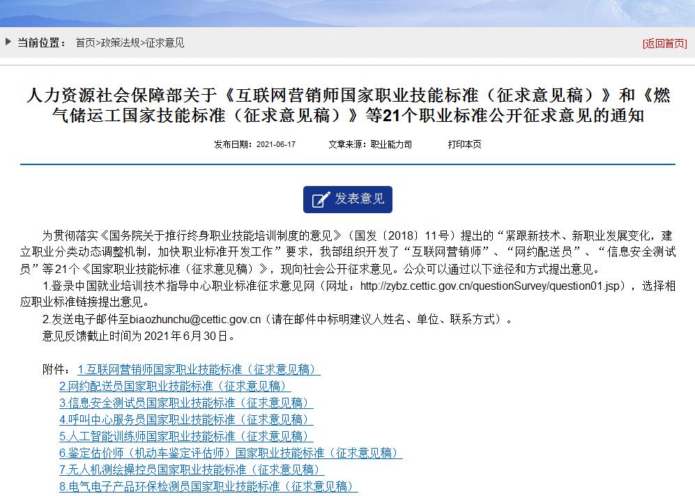 人力資源社會保障部關(guān)于《互聯(lián)網(wǎng)營銷師國家職業(yè)技能標準(征求意見稿)》和《燃氣儲運工國家技能標準(征求意見稿)》等21個職業(yè)標準公開征求意見的通知