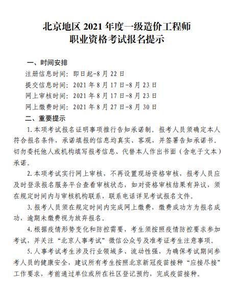 北京地區(qū)2021年度一級(jí)造價(jià)工程師職業(yè)資格考試報(bào)名提示