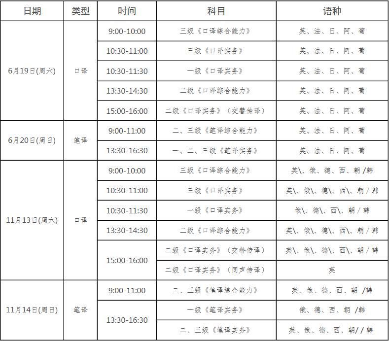 筆譯考試批次劃分視報(bào)名情況另行確定??谧g、筆譯考試各級(jí)別、各科目的考試時(shí)間安排見上表:2021年度翻譯考試時(shí)間安排(各位考生依據(jù)最終打印出的準(zhǔn)考證為準(zhǔn))。