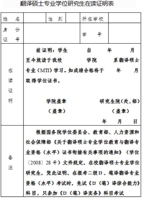 在讀翻譯碩士專業(yè)學(xué)位研究生報(bào)考二級(jí)翻譯考試時(shí),可免試《口(筆)譯綜合能力》科目,只參加《口(筆)譯實(shí)務(wù)》科目考試。憑學(xué)校開具的“翻譯碩士專業(yè)學(xué)位研究生在讀證明”(見附件1,加蓋學(xué)校公章),方可免試《口(筆)譯綜合能力》科目。截至2020年底,全國(guó)259所翻譯碩士專業(yè)學(xué)位(MTI)教育試點(diǎn)單位名單見附件2。