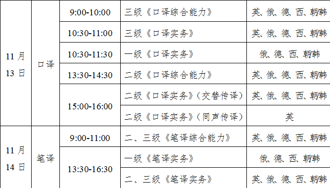 (二)翻譯考試設(shè)英語、日語、俄語、德語、法語、西班牙語、阿拉伯語、朝鮮語/韓國語、葡萄牙語等9個語種,每個語種分為一、二、三級,各語種、各級別均設(shè)口譯和筆譯考試。應(yīng)試人員須在當(dāng)次考試中通過所報(bào)考語種、級別的口譯或筆譯全部科目,方可取得資格證書。