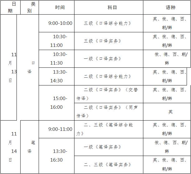 口譯、筆譯考試各級(jí)別、各科目的考試時(shí)間安排見(jiàn)附件1。