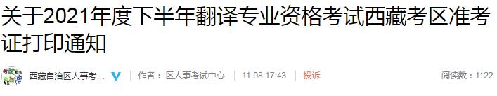 關(guān)于2021年度下半年翻譯專業(yè)資格考試西藏考區(qū)準考證打印通知