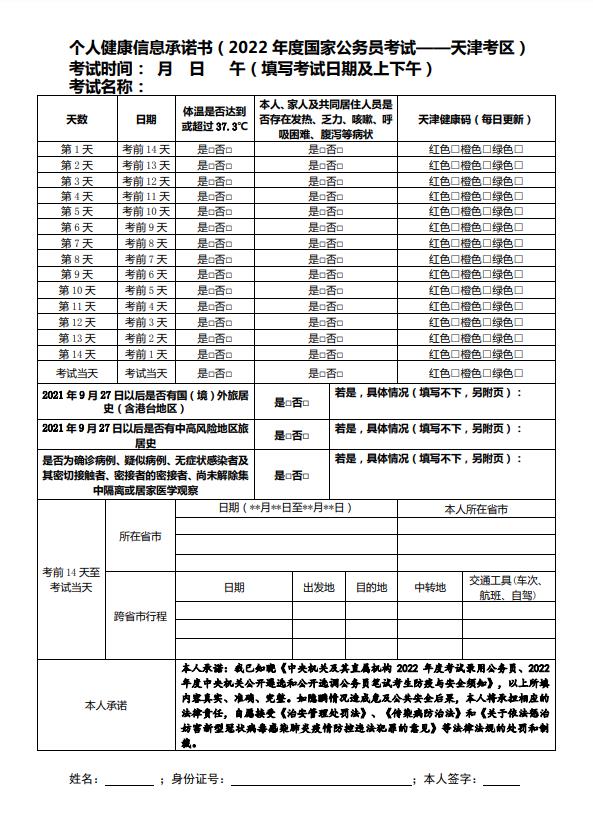 四.考生須登錄天津市人力資源和社會保障局網(wǎng)站天津人事考試版塊“通知公告”欄目(網(wǎng)址http://hrss.tj.gov.cn/jsdw/rsksw/),下載打印《中央機關(guān)及其直屬機構(gòu)2022年度考試錄用公務(wù)員、2022年度中央機關(guān)公開遴選和公開選調(diào)公務(wù)員筆試(天津考區(qū))考生防疫與安全須知》的附件《個人健康信息承諾書》和《流行病學(xué)調(diào)查表》,如實填報并承諾真實性。考生須持本人填寫的紙質(zhì)《個人健康信息承諾書》和《流行病學(xué)調(diào)查表》(請?zhí)崆疤顚懚喾?,每科目考試交監(jiān)考人員一份)進入考點考場。