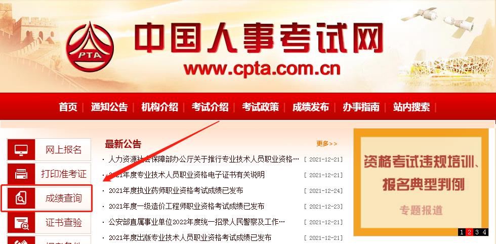1、登錄中國(guó)人事考試網(wǎng)官網(wǎng)(網(wǎng)址:www.cpta.com.cn)。左側(cè)找到并點(diǎn)擊“成績(jī)查詢”按提示錄入考生信息,登錄查詢。