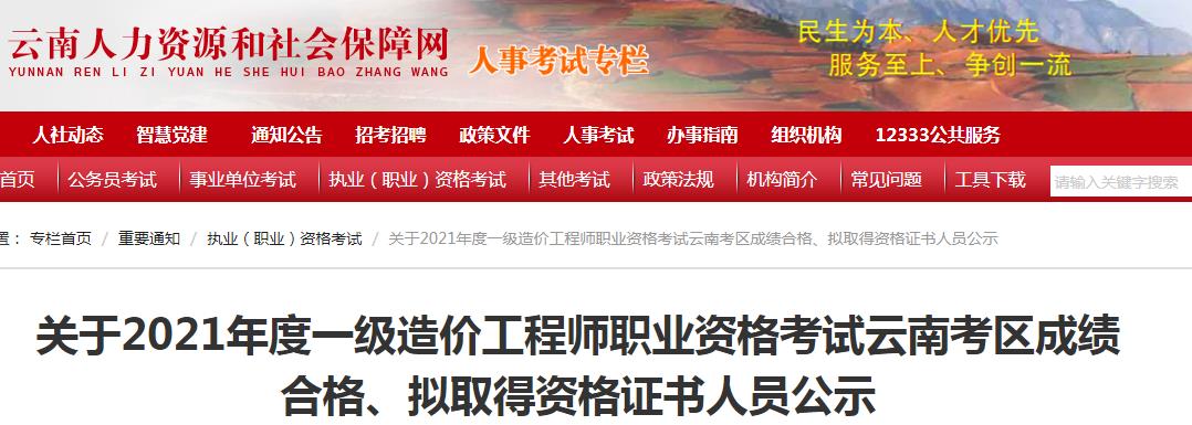 關(guān)于2021年度一級造價工程師職業(yè)資格考試云南考區(qū)成績合格、擬取得資格證書人員公示