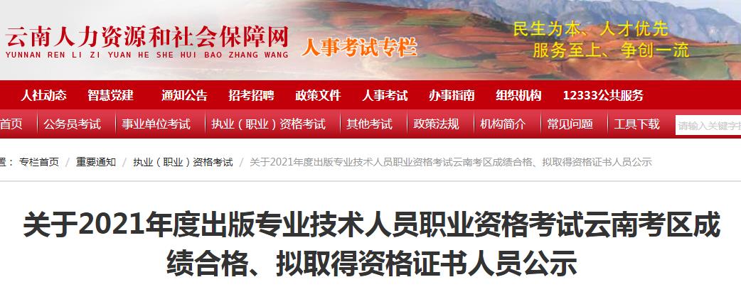 關(guān)于2021年度出版專業(yè)技術(shù)人員職業(yè)資格考試云南考區(qū)成績合格、擬取得資格證書人員公示