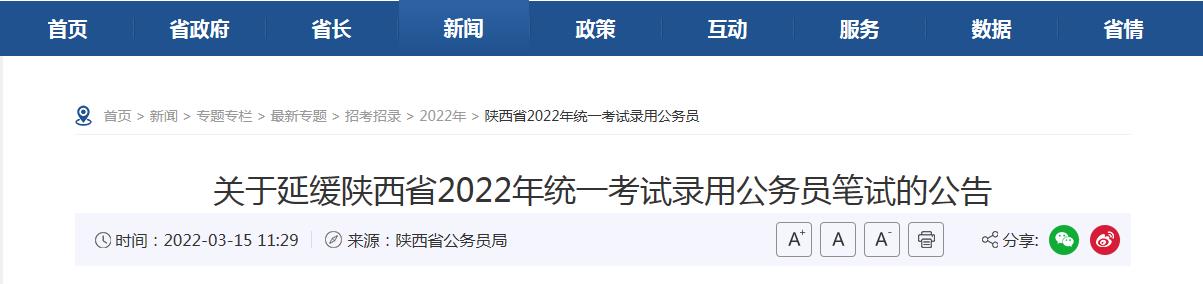關(guān)于延緩陜西省2022年統(tǒng)一考試錄用公務員筆試的公告