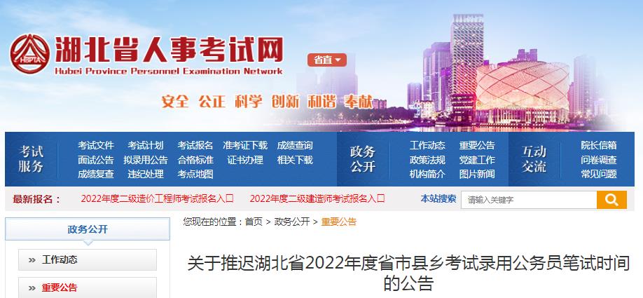 關(guān)于推遲湖北省2022年度省市縣鄉(xiāng)考試錄用公務(wù)員筆試時(shí)間的公告