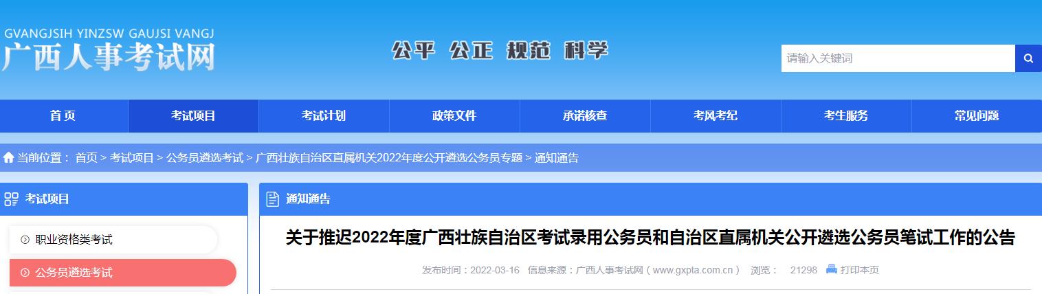 關(guān)于推遲2022年度廣西壯族自治區(qū)考試錄用公務(wù)員和自治區(qū)直屬機(jī)關(guān)公開(kāi)遴選公務(wù)員筆試工作的公告