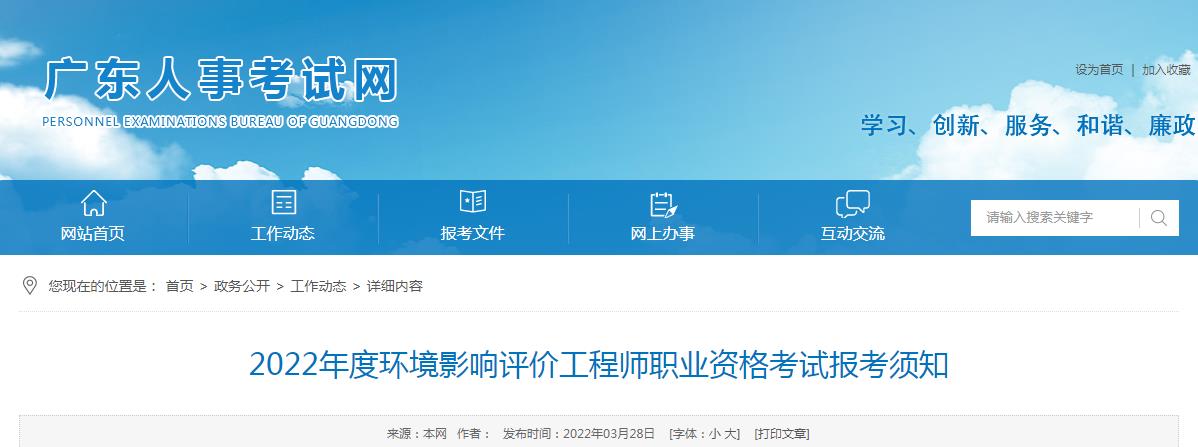 根據(jù)人力資源和社會(huì)保障部人事考試中心《關(guān)于做好2022年度環(huán)境影響評(píng)價(jià)工程師職業(yè)資格考試考務(wù)工作的通知》(人考中心函〔2022〕9號(hào))和廣東省人力資源和社會(huì)保障廳《關(guān)于廣東省人力資源社會(huì)保障系統(tǒng)2022年度專業(yè)技術(shù)人員職業(yè)資格考試計(jì)劃及有關(guān)事項(xiàng)的通知》(粵人社函〔2022〕21號(hào))要求,為方便廣大考生報(bào)考該項(xiàng)考試,現(xiàn)將有關(guān)事項(xiàng)告知如下。