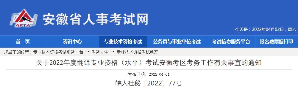 關(guān)于2022年度翻譯專業(yè)資格(水平)考試安徽考區(qū)考務(wù)工作有關(guān)事宜的通知