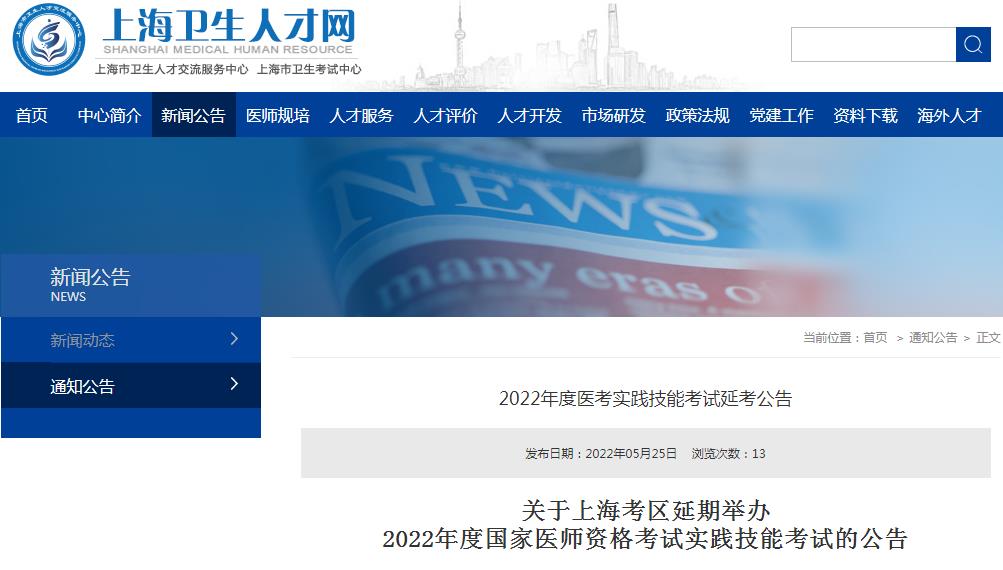 關(guān)于上??紖^(qū)延期舉辦2022年度國家醫(yī)師資格考試實踐技能考試的公告 為切實做好本市新冠肺炎疫情防控工作,原定于今年6月13日至26日舉行的2022年度國家醫(yī)師資格考試實踐技能考試(上海考區(qū))延期舉行,具體時間另行確定。