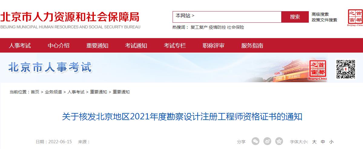 關于核發(fā)北京地區(qū)2021年度勘察設計注冊工程師資格證書的通知