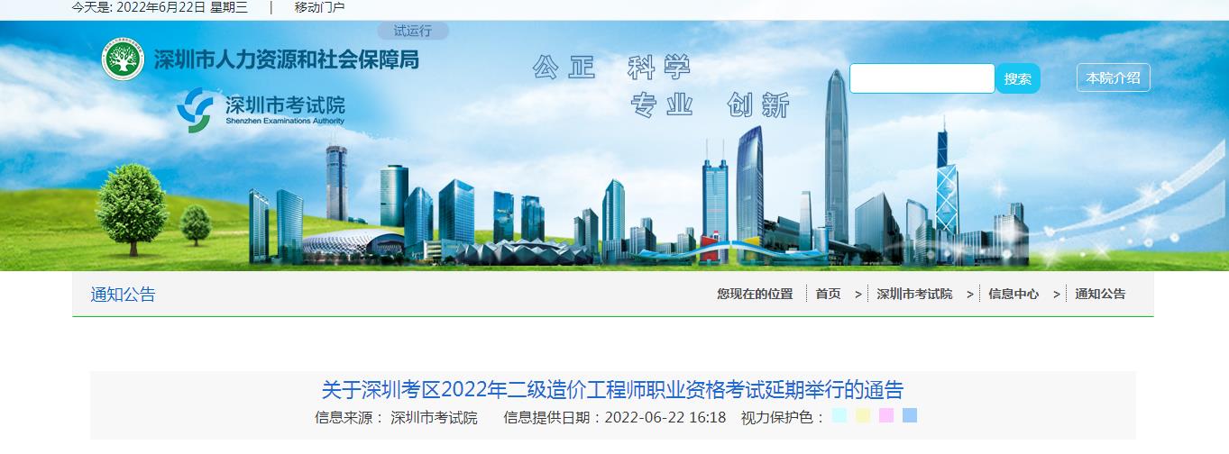 關(guān)于深圳考區(qū)2022年二級造價工程師職業(yè)資格考試延期舉行的通告