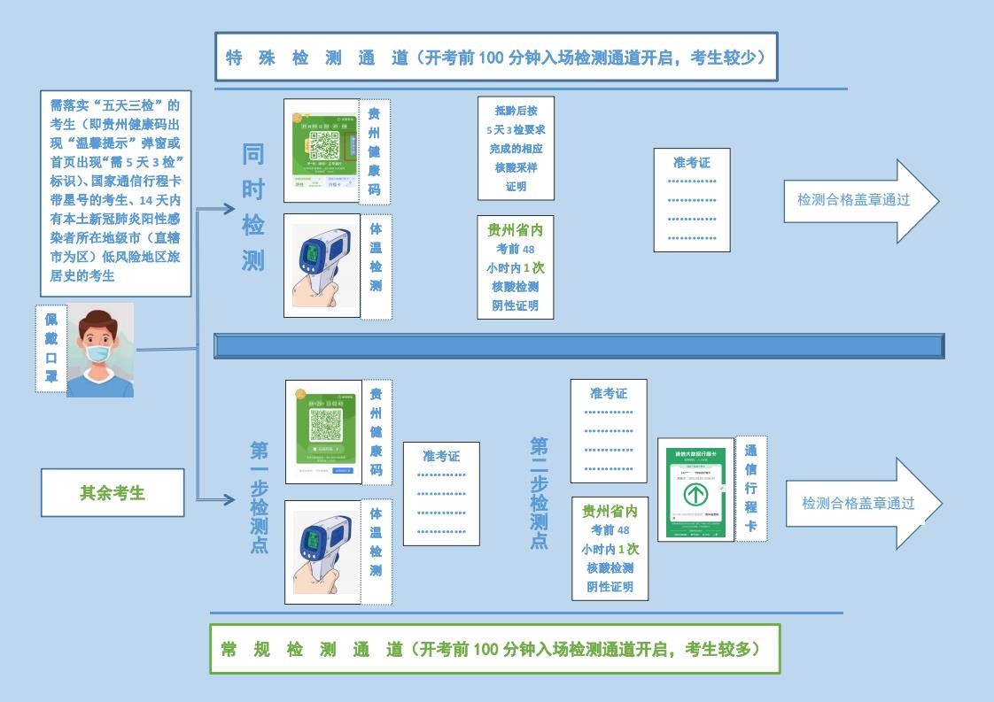考生須提前準備好考試當天本人“貴州健康碼綠碼”和《準考證》報檢測人員核驗并接受體溫檢測。