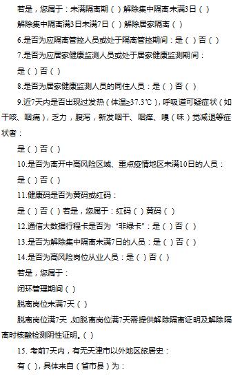 15. 考前7天內(nèi),有無天津市以外地區(qū)旅居史: