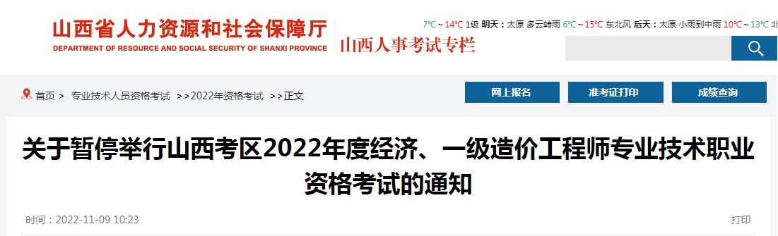 關(guān)于暫停舉行山西考區(qū)2022年度經(jīng)濟(jì)、一級造價工程師專業(yè)技術(shù)職業(yè)資格考試的通知