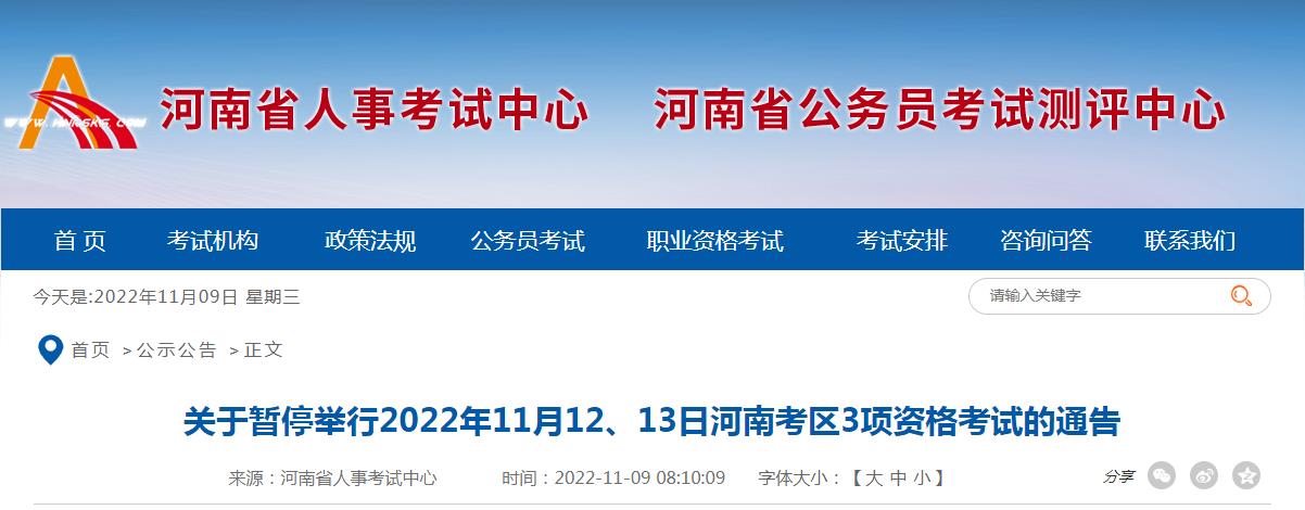 關(guān)于暫停舉行2022年11月12、13日河南考區(qū)3項(xiàng)資格考試的通告