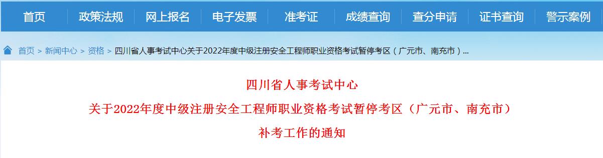 四川省人事考試中心關(guān)于2022年度中級(jí)注冊(cè)安全工程師職業(yè)資格考試暫停考區(qū)(廣元市、南充市)補(bǔ)考工作的通知