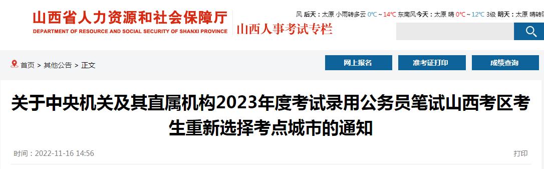 關(guān)于中央機(jī)關(guān)及其直屬機(jī)構(gòu)2023年度考試錄用公務(wù)員筆試山西考區(qū)考生重新選擇考點(diǎn)城市的通知