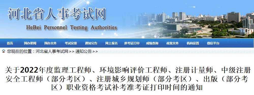 由于疫情原因,我省2022年度監(jiān)理工程師、環(huán)境影響評(píng)價(jià)工程師、注冊(cè)計(jì)量師、中級(jí)注冊(cè)安全工程師(部分考區(qū))、注冊(cè)城鄉(xiāng)規(guī)劃師(部分考區(qū))、出版(部分考區(qū))職業(yè)資格考試補(bǔ)考準(zhǔn)考證打印開始時(shí)間,統(tǒng)一調(diào)整為11月23日15時(shí)。請(qǐng)您及時(shí)打印準(zhǔn)考證,并隨時(shí)關(guān)注本網(wǎng)站的有關(guān)公告。