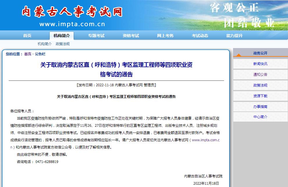 當(dāng)前我區(qū)疫情防控形勢(shì)依然嚴(yán)峻,特別是呼和浩特市疫情防控工作正處在關(guān)鍵時(shí)期,為保障廣大報(bào)考人員身體健康,經(jīng)請(qǐng)示自治區(qū)疫情防控指揮部進(jìn)行綜合研判,決定取消原定于11月26、27日在呼和浩特舉行的區(qū)直考區(qū)監(jiān)理工程師、出版專業(yè)技術(shù)人員、注冊(cè)城鄉(xiāng)規(guī)劃師、中級(jí)注冊(cè)安全工程師四項(xiàng)職業(yè)資格考試。已經(jīng)報(bào)名并繳費(fèi)成功的報(bào)考人員統(tǒng)一安排退費(fèi),已繳費(fèi)用全額退回至原付款賬戶。考試合格成績(jī)實(shí)行滾動(dòng)管理的,報(bào)考人員已取得的合格成績(jī)有效期相應(yīng)延長(zhǎng)一年。請(qǐng)廣大報(bào)考人員密切關(guān)注內(nèi)蒙古人事考試網(wǎng)(www.impta.com.cn)和內(nèi)蒙古人事考試院官方微信公眾號(hào),以便及時(shí)了解相關(guān)信息。