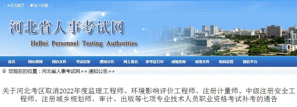 關于河北考區(qū)取消2022年度監(jiān)理工程師、環(huán)境影響評價工程師、注冊計量師、中級注冊安全工程師、注冊城鄉(xiāng)規(guī)劃師、審計、出版等七項專業(yè)技術人員職業(yè)資格考試補考的通告