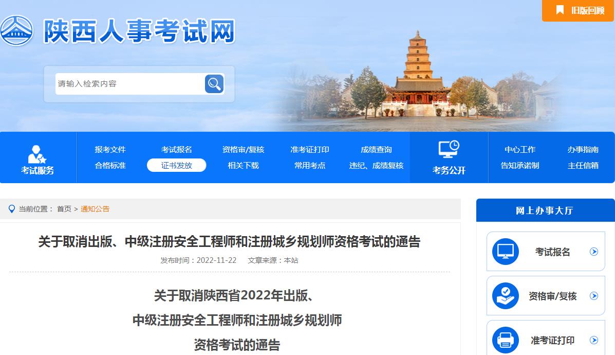 關(guān)于取消陜西省2022年出版、中級(jí)注冊(cè)安全工程師和注冊(cè)城鄉(xiāng)規(guī)劃師資格考試的通告