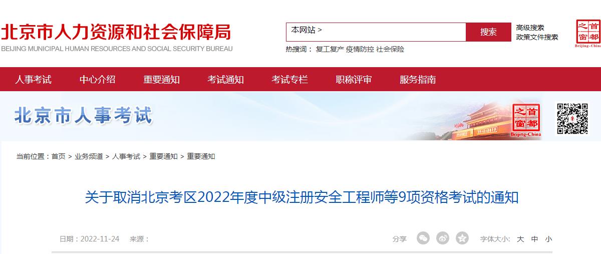 關(guān)于取消北京考區(qū)2022年度中級(jí)注冊(cè)安全工程師等9項(xiàng)資格考試的通知