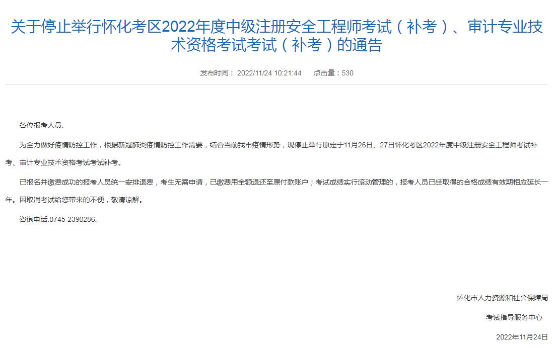?關(guān)于停止舉行懷化考區(qū)2022年度中級(jí)注冊(cè)安全工程師考試(補(bǔ)考)、審計(jì)專業(yè)技術(shù)資格考試考試(補(bǔ)考)的通告