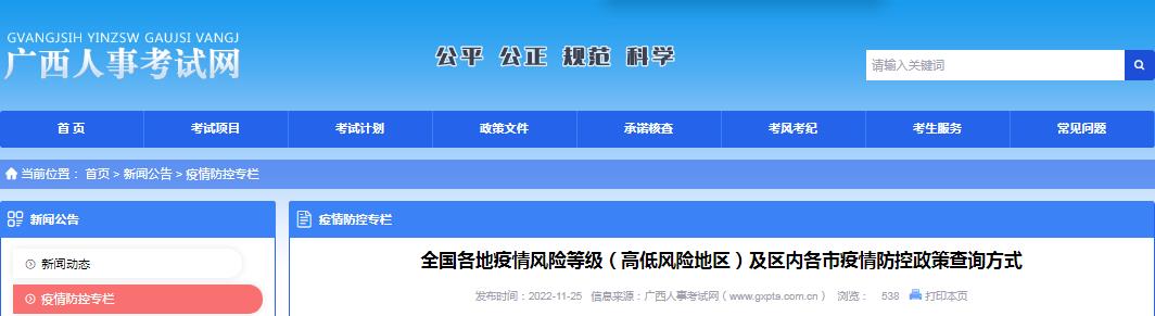 考生可通過 “國務(wù)院客戶端”小程序的“各地疫情防控政策”和 “智桂通”小程序的“疫情防控”選擇“各地出行政策”版塊查詢。桂林市: