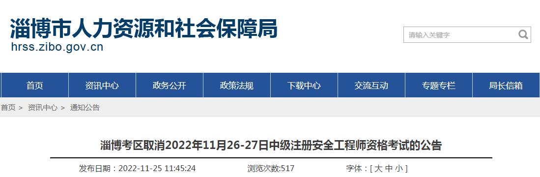 淄博考區(qū)取消2022年11月26-27日中級注冊安全工程師資格考試的公告