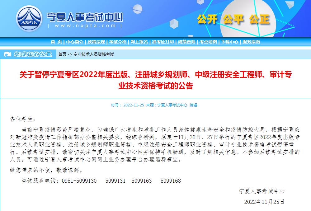 關(guān)于暫停寧夏考區(qū)2022年度出版、注冊城鄉(xiāng)規(guī)劃師、中級注冊安全工程師、審計(jì)專業(yè)技術(shù)資格考試的公告
