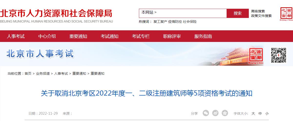 關(guān)于取消北京考區(qū)2022年度一、二級(jí)注冊(cè)建筑師等5項(xiàng)資格考試的通知