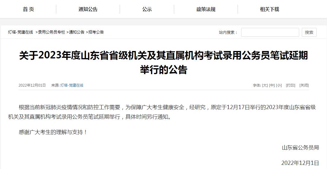 根據(jù)當前新冠肺炎疫情情況和防控工作需要,為保障廣大考生健康安全,經(jīng)研究,原定于12月17日舉行的2023年度山東省省級機關(guān)及其直屬機構(gòu)考試錄用公務(wù)員筆試延期舉行,具體時間另行通知。