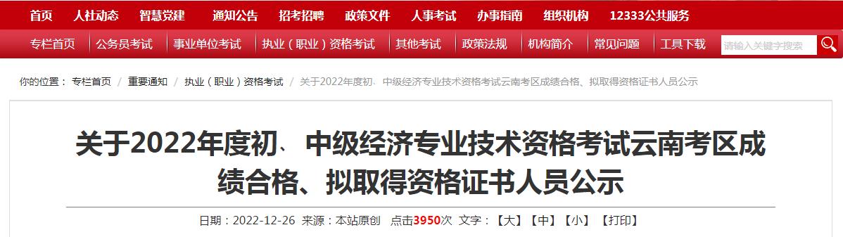 關(guān)于2022年度初﹑中級(jí)經(jīng)濟(jì)專業(yè)技術(shù)資格考試云南考區(qū)成績(jī)合格、擬取得資格證書人員公示