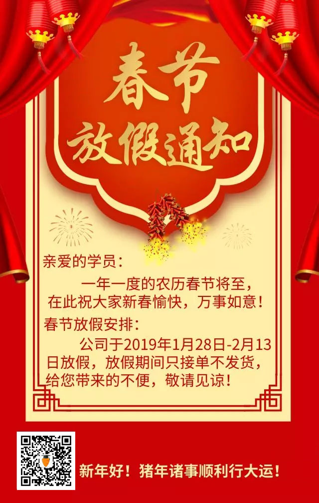 請(qǐng)各位學(xué)員提前做準(zhǔn)備,給您造成的不便敬請(qǐng)諒解,感謝大家長(zhǎng)期對(duì)我們工作的大力支持與信任。學(xué)學(xué)網(wǎng)攜全體員工提前預(yù)祝大家2019年春節(jié)快樂(lè)!闔家幸福!祝大家豬年幸福美滿、諸事順利、開(kāi)心快樂(lè)!并通過(guò)你們向你們的家人致以節(jié)日的問(wèn)候,祝愿你們?nèi)倚腋0部担?/p>